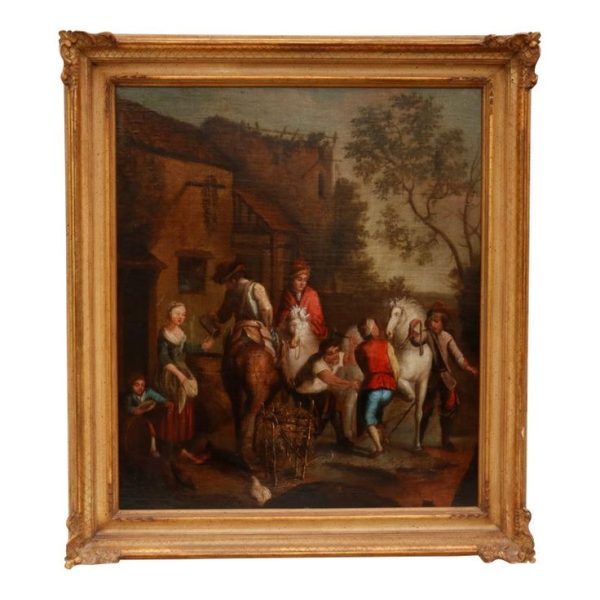 A framed 18th Century English oil on canvas. The painting depicts a country scene and is set in a gilt wooden frame with carved accents at the corners.