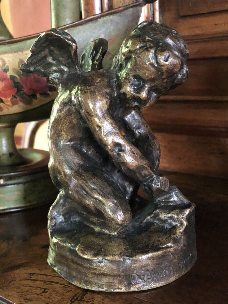 Antique Bronze Sculpture Love Repairing Bow Statue Cupid Figure Rare Old 20th