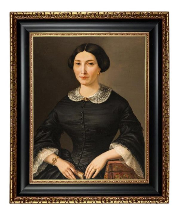 Accurate reproduction of the original c. 1840 French oil painting. The image is printed on canvas, mounted to a board and treated with a historic looking varnish. The frame is black and antiqued gold resin. The back is finished with craft paper and a wire hanger.