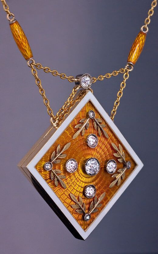 A Magnificent Antique Russian Enameled Gold Diamond Locket Necklace made in St. Petersburg between 1908 and 1917 56 zolotniks gold (14K – 583), 88 zolotniks silver.