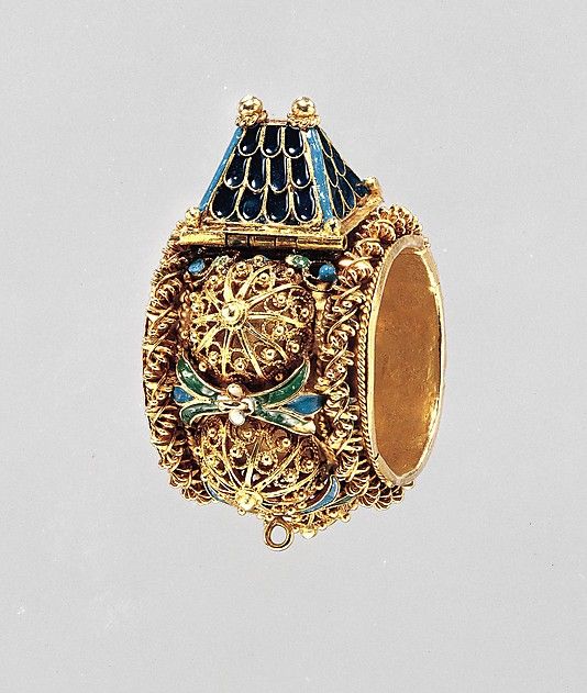 It is difficult to date and localize the large, ornamented rings that were created for use in synagogues during the wedding ritual. However, there is ample evidence that examples such as this one were exchanged during Italian Jewish weddings.