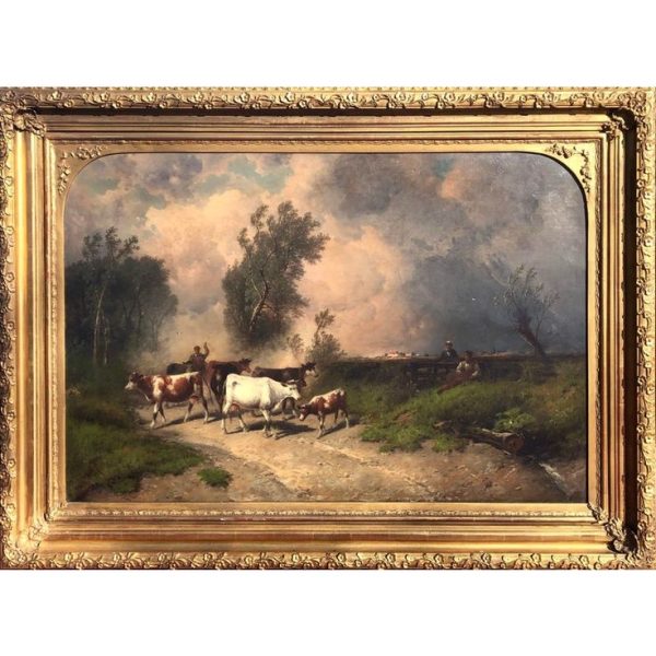 Exceptional, large-scale 19th Century Bucolic Landscape painting in gorgeous original gilt wood frame with floral details. From the realistic portrayal of the cows, to the masterfully done light in the clouds and detailed trees, this painting commands a room. Oil on canvas, signed “W Nicholsen” lower left.